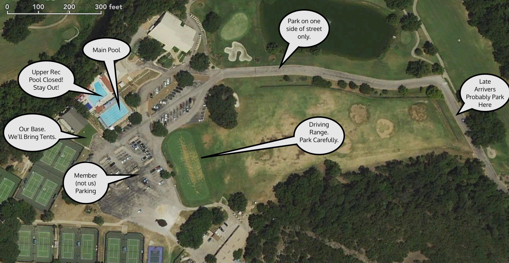 Our warmup starts at 4:30 - but parking is "a challenge." If you're an Age Group Parent, please arrive between 4 and 4:15 and bring your own chair. Everybody bring bug spray - I hear it's bad with all the rain last month. Expect to park hundreds of feet away - see image below. The main parking lot is "members only" and they'll have a "volunteer" helping us avoid parking improperly. Seriously, though, you can drop off, but expect to park far away if you arrive late. Don't park in the fire lanes unless you like tickets. (It's happened.) Note the Driving Range on your left as you drive up - you may choose to park further away once you see golfers hitting balls in your general direction.